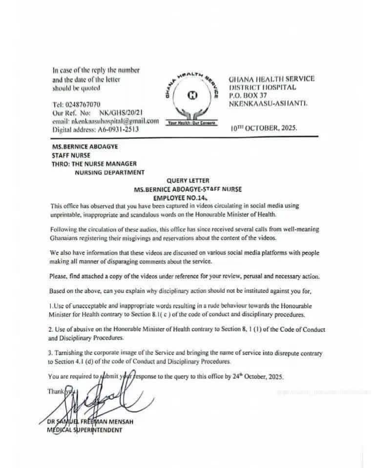 At the heart of the controversy is Bernice Aboagye, a nurse at Nkenkansu Hospital, who was captured in videos circulating on social media using what the GHS described as “unprintable, inappropriate, and scandalous” language directed at Health Minister Kwabena Mintah Akandoh. The Service, in a memo dated October 10, 2025, expressed grave concern over her conduct, noting that the videos had triggered “widespread public backlash and negative commentary online”.